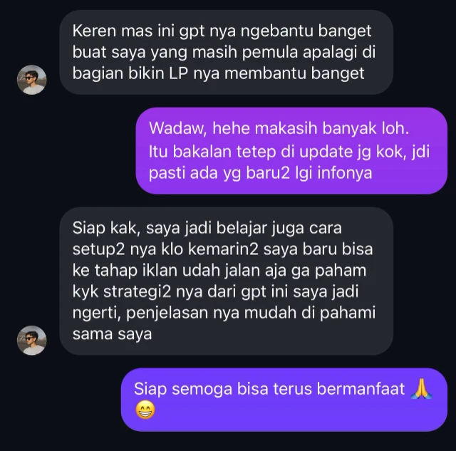 - Custom GPT ini terus di-update saat ada perbaikan template, checklist LP, WA script, sheet angka (CPL/CPA/BEP), atau contoh creative/copy.